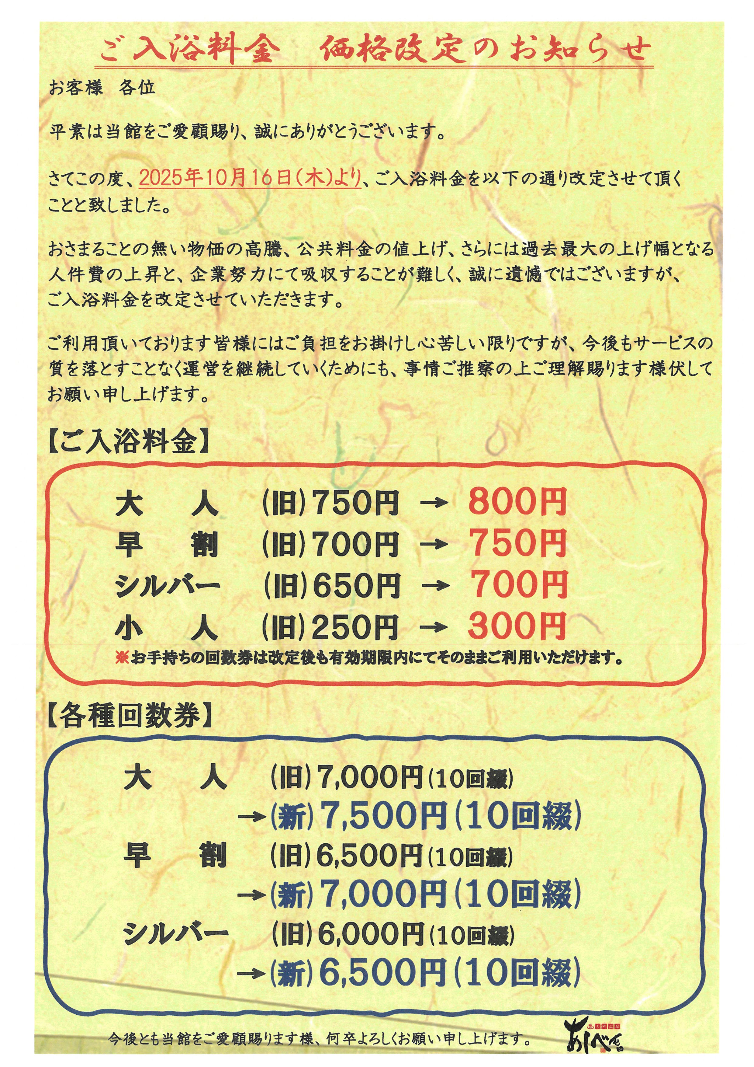 この度、2025年10月 16日(木)よりご入浴料金等を改定させて頂く事と致しました。